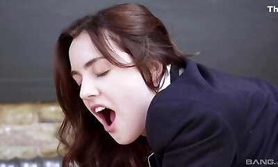 Redhead student masturbates with her thumbs