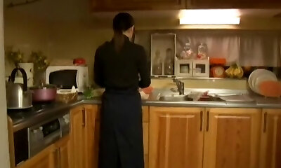 dziewczyna otwarte w krótkich koszulkach śmigam podczas mycia naczyń
